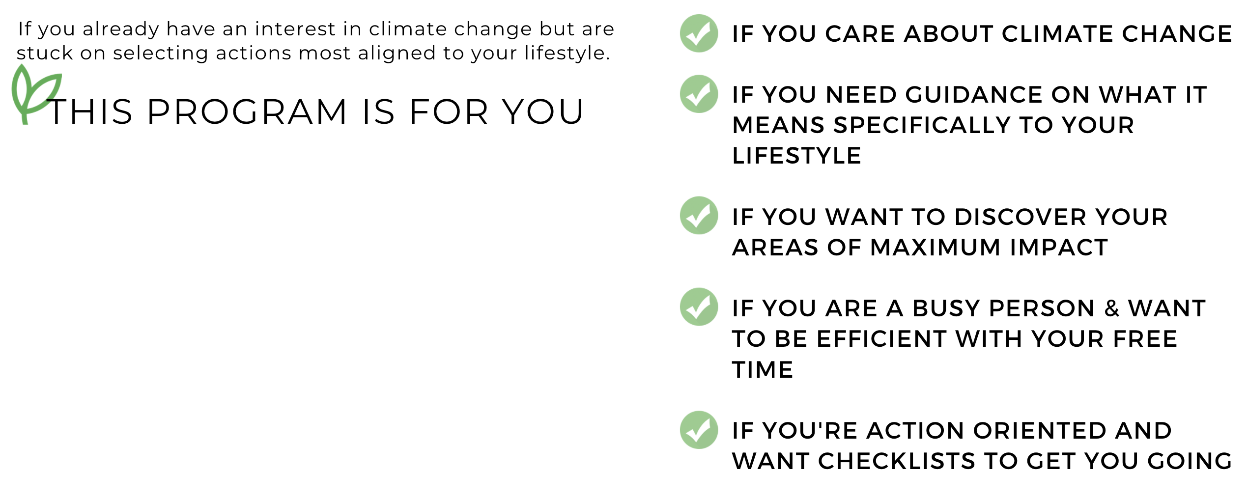 No overwhelm, only empowerment. Absolutely this program is for you if you're just beginning to discover the details of sustainable living and climate change. We designed it so it meets you where you're at plus uses language that's easy to digest. The first session is on a free-preview so you can have 100% confidence in our approach to this topic and its alignment to you.